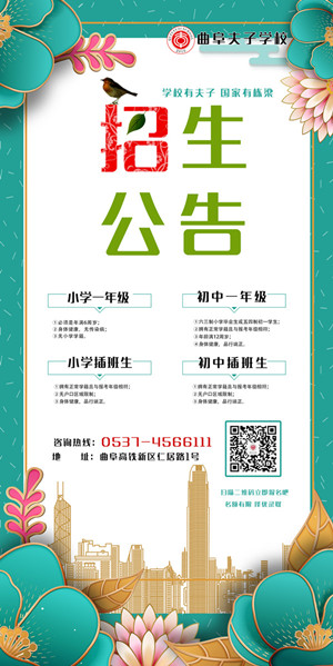 曲阜夫子学校创办于2016年,坐落于曲阜高铁新城,是由九巨龙集团投资7.56亿元,曲阜市重点引进的一所K12的现代化、国际化高标准学校。学校占地357亩,校舍建筑面积12.3万平方米,总容纳132个班。学校配套设施齐全,教学设备先进,师资力量雄厚,基础生源稳定,办学成绩突出。学校现有在校学生2600余人,79个班级。2020年418名学生参加高考,本科上线312人,上线率74.6%;重点本科上线77人,上线率18.4%。其中,三个班本科上线率为100%。2020年中考550分以上的特优生比率11%,500分以上的优生比率49%,中考平均分、优秀率均名列全市前茅。
